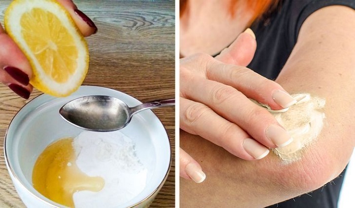 Honey is a natural way to keep skin soft. When mixed with lemon, it can do great things for your skin. Mix 2 tablespoons of honey, the juice of half a lemon, and 1 teaspoon of baking soda. Apply the mixture to the dark areas of your elbows and knees. Let it remain on for 20 to 30 minutes, then wash it off.