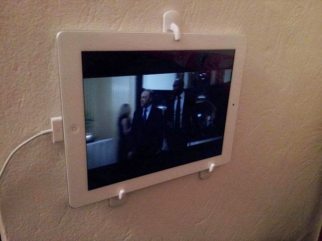 Use the command hooks to hook your iPad to the wall and making a makeshift entertainment center for yourself. You can easily hook the iPad to the wall or the ceiling in order to view the movies or your favourite TV shows comfortably.