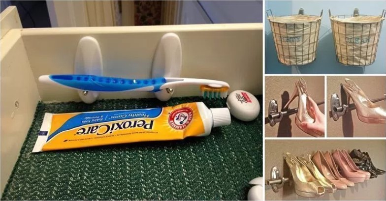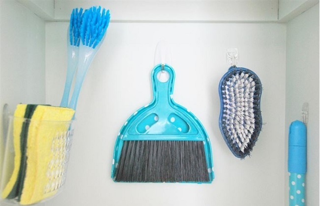 A cleaning closet contains many things like cleaning fluid, cleaning mops and scrappers. You can easily hang the mops and scrappers using the command hook making room for bottles and containers of fluids.