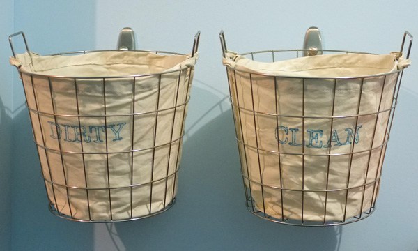 You can save a lot of floor space by using the command hooks in your living rooms. You can put the hooks on the walls and use them to hang baskets from it. Then put your laundry bags in the baskets and using them as laundry hampers.
