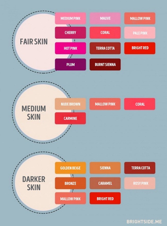 You can choose a matching lipstick color with the tone of your skin. This chart will help you immensely in choosing the right color for right skin tone. A pearl lipstick highlights all the shortcomings your face has. Every blemish, every spot, every nook and cranny is exposed by that lipstick. That’s why use a matte lipstick, if you have big lips, as they help in making such lips looking slim.