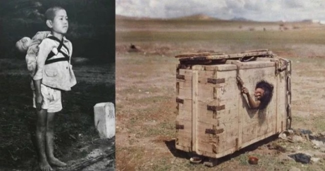 This pic from 1913 depicts a young Mongolian women been stuffed into a wooden box and left in the open to die from starvation. She is seen trying to find a way out for her using the hole cut for air. The photo was taken in July 1913 by French photographer Albert Kahn. It was first published in National Geographic issue in 1922.