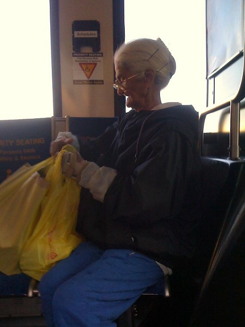 The lady sitting on a chair with some plastic bags in her hand is looking exactly like the character of grandmother from Tweety. She is dressed like her as well. She is oblivious to fact that she resembles grandmother from tweety.