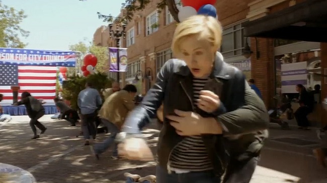 The episode opens up with the mass shooting at the political rally, a scene that was edited out of respect for the Las Vegas attack victims and their families. So we only hear the gunshots, see dead people on the ground and Kai lying on the stage. The sequence ends with the police telling Ally to drop her weapons, and we are led to believe that she is the attacker.