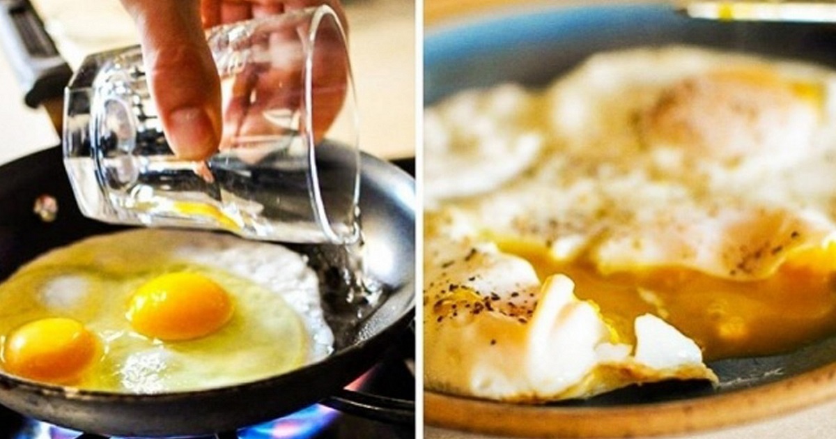First, break the eggs into the pan, add water instead of oil and place the pan on the heater or gas. This way you get perfect eggs and a liquid yolk.