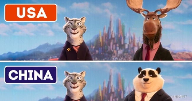 In the most ambitious character of animated movies adapted for different countries, the news anchor in Zootopia was portrayed differently in various countries. North America, France and Canada had a moose while Japan had a racoon dog, Australia and New Zealand a Koala and China a panda. UK had a corgi while Brazil had a jaguar.