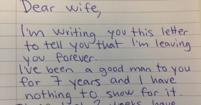The husband wrote a nice letter to his wife asking her for a divorce. In the letter, he wrote the following lines. "Dear wife, I’m writing you this letter to tell you that I’m leaving you forever. I’ve been a good man to you for 7 years & I have nothing to show for it. These last 2 weeks have been hell. Your boss called to tell me that you quit your job today & that was the last straw."