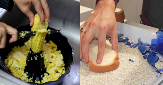 When you want to remove corn kernels from the cob, stand the corn cob in the middle of a bundt pan and use a sharp knife to slice off the corn kernels smoothly. The kernels fall into the pan and the cob remains in your hands at the middle of the pan.