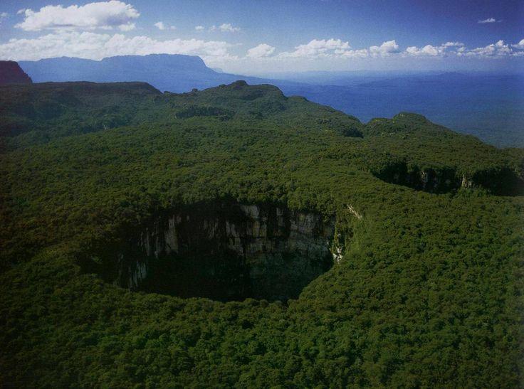 This is found in the Bolívar State, Venezuela near the border of Mexico. On the top of the mountain can be found 4 perfectly round sinkholes. The sinkholes are 352 meters wide and 314 meters deep. The sinkholes can only be seen from the sky as the area around it is covered in a lush green forest.