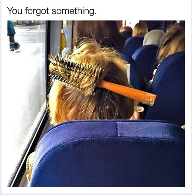 If you think your Monday mornings are terrible just have a look at this woman who has a hairbrush stuck to her blonde waves. The worst part is nobody offered to take it out of her head. Can you imagine what happens when she walks into work with this in her hair?