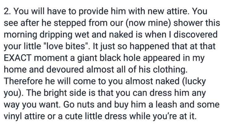 She told Jennifer to arrange some new attire for her husband as she took all his clothes and have no plans to return them to him. She wrote that she took all his clothes so he can come to Jennifer almost naked. The mistress can dress him the way she wants.