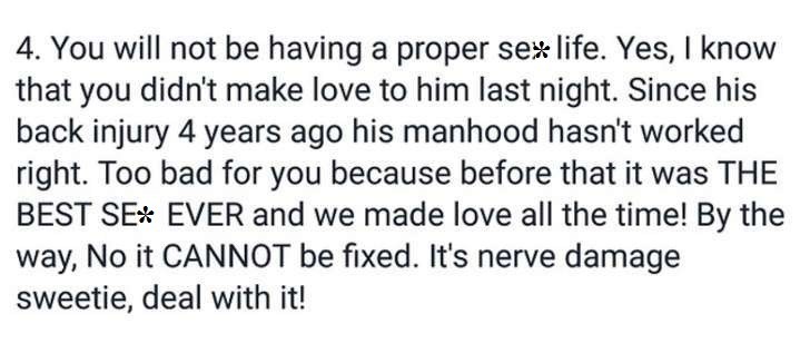 She wrote that the mistress will not have a proper se* life as her husband’s manhood has not worked right after his back injury four years ago.