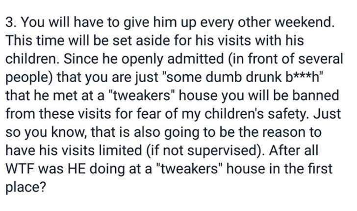 She told Jennifer to give her husband up every other weekend to spend some time with his children. However, the mistress is not allowed to visit her home to ensure the children’s safety. She wrote that since her husband openly admitted that Jennifer is just some dumb drunk b***h, she will be not allowed to visit her children.