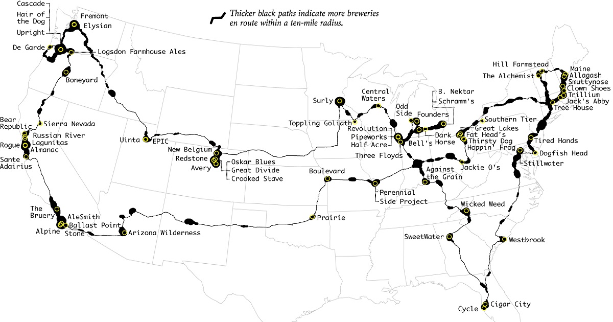 Are you a beer guzzler who just loves a pint of craft beer? Then this article is definitely for you as it shows you how you can go on a road trip visiting all those famous craft breweries in the USA. There are approximately 3464 craft breweries across the country so wouldn’t it be fantastic if you could go on a road trip to the best of them sampling all that fantastic beer? This will show you the easiest path as chalked out by the site “Flowing Data” whose link can be found at the end of this article so that you can visit the best breweries in the country.