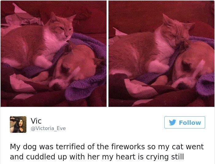We have always heard about the enmity of dog and cats. But see this picture, this is how my cat always comforts my dog whenever my dog is scared of the firework sounds. Remarkable love story shared by my cat and dog! My joy knows no bounds whenever I see them like this.