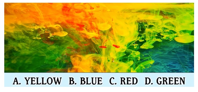 Here is a color splash that contains all four primary colors being red blue green and yellow. Look at the picture carefully and then decide which color comes off as the brightest to you. It could be red or yellow, make a choice. Note down the scores below.