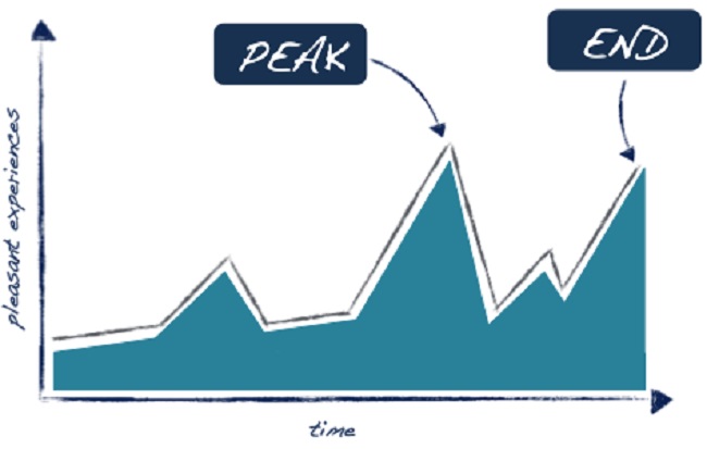 According to a series of experiments conducted by Barbara Fredrickson and Daniel Kahneman, people judge an experience largely based on how they felt at its peak and at its end rather than based on the total sum or average of every moment of the experience. The effect of the experience can be pleasant or unpleasant. Thus they termed it as peak-end rules a psychological heuristics i.e. focusing on one aspect of a complex problem and ignoring others. This happens because people exhibit better memory for more intensely emotional events than less intensely emotional events. So an interesting movie might become average one if it has a mediocre scene at the end while an annoying friend will be attractive if she compliments you at the end of the day.