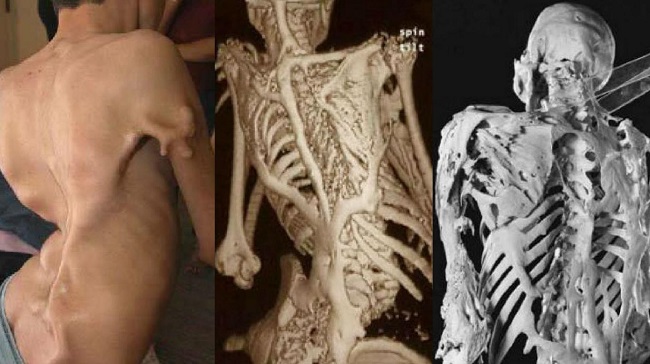 An extremely rare mutation where muscles and tendons are replaced by bones. A person suffering from Fibrodysplasia will have an excess of bone tissues which will obviously restrict their movement and eventually the person won't be able to move at all. This condition could also be fatal and there are no certified treatments for this.