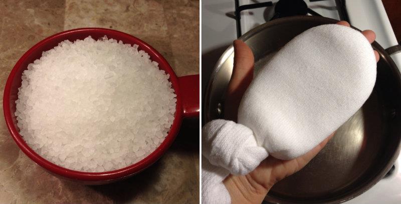 Now either uses a cloth and place the heated salt on it and folds it, using a rubber band to seal the open end. Or you may use a sock to fill it with heated salt and tied the opened end. Now place the cloth/sock over the infected ear for 5-10 minutes. You may need to repeat the process several times as needed. The salt, when heated, will draw out the fluid from the ear and relief it of pain.