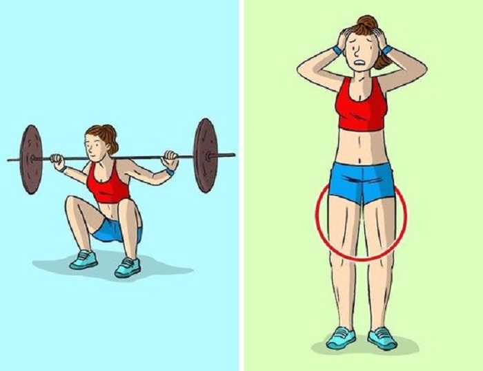 Weighted heavy squats can hurt your waist. But it’s not just about your waist; your legs matter too. First of all, doing a lot of weighted exercises can make your hips look less girly and bulky. Second, lifting heavy weights can harm not only your body shape but also your knees and lower back.