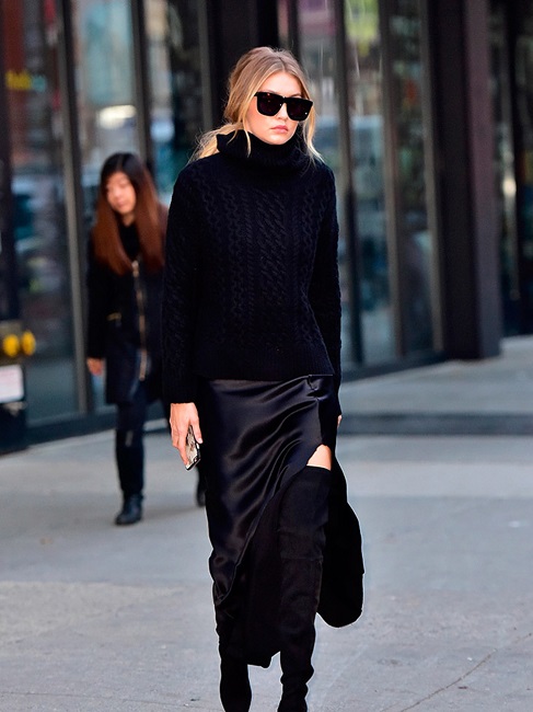 The perfect off duty supermodel look for Gigi is a black baggy sweater and a leather skirt. To top it off, of course, she chose black shades and thigh-high boots. The boots only work as her skirt has an incredible slit.