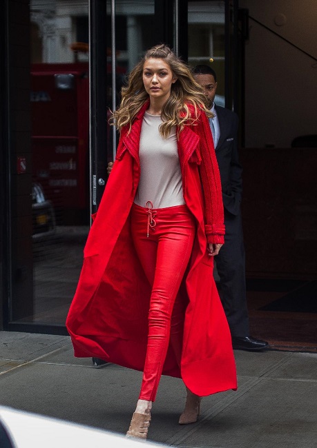 Gigi sported a long, pea green coat by Zimmermann one winter, and gave way for the most statement-esque of her looks. The long coat paired with denims and a simple tee was an incredible wardrobe choice. The nude loafers only help her minimalist look.