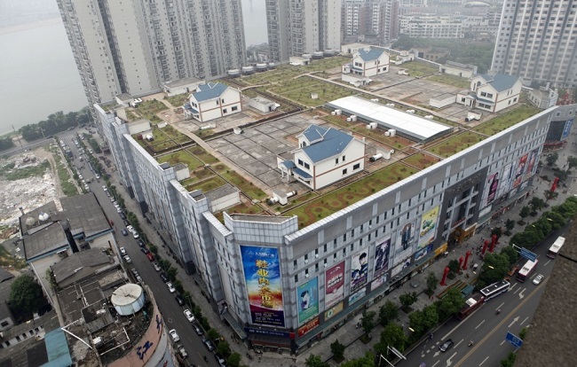 Hunan has almost 4 million people which makes housing scarce. That is why architects aesthetically use practical and space saving solutions choosing to build houses even on top of shopping malls.