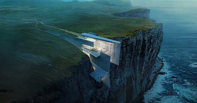 The unusual design of this building that has integrated green moss on the rooftop gives it an appearance of merging into the landscape. A perfect example of a house in the lap of solitude. The pine trees are an additional reward.
