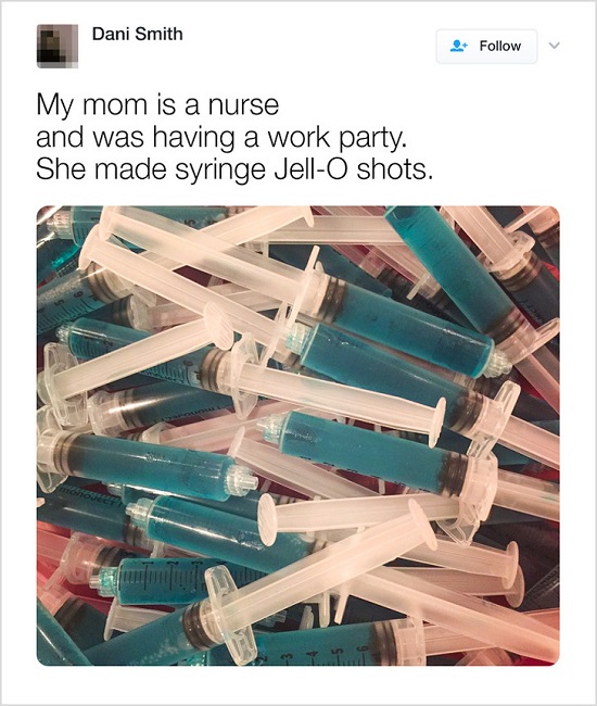 This is what happens when your mom or a family member is a nurse with medical items always on their mind. Invariably it filters into their creative sense of humor at arranging snacks at parties too.