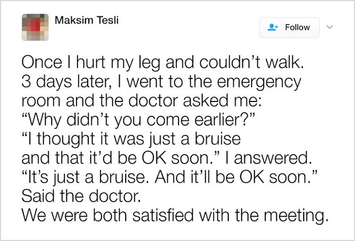 This guy goes to the doctor after three days of having his leg bruised. Explaining t the doctor something that you assume is right will only flummox your doctor. Seems this doctor has a sense of humor and decided to agree. Both were happy.