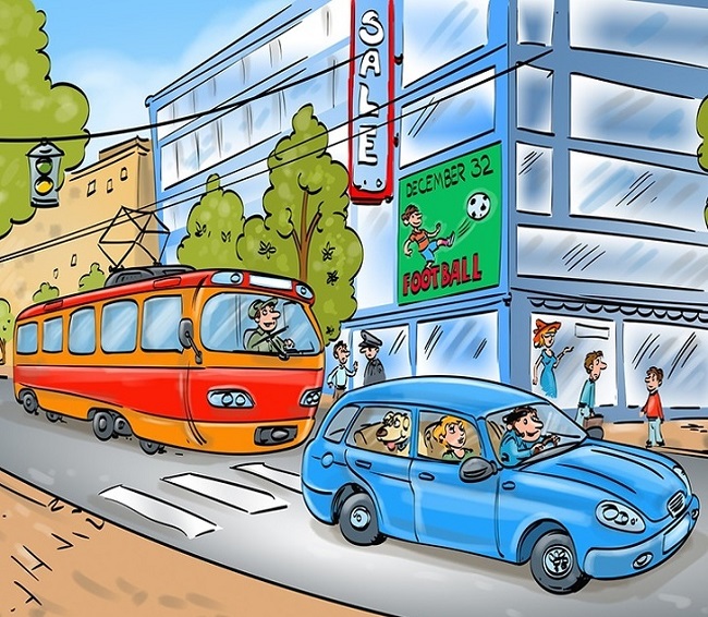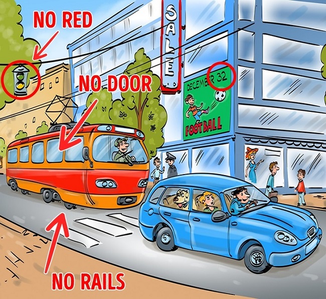 The mistakes in this image are right in front of your eyes, but well hidden. The first mistake is that the football poster shows a date that doesn’t exist –December 32. The second mistake is that there are no doors to the tram and the tram is also traveling without any rails on the road. The last mistake is that the signal on the top has only green and yellow colors and no red color.