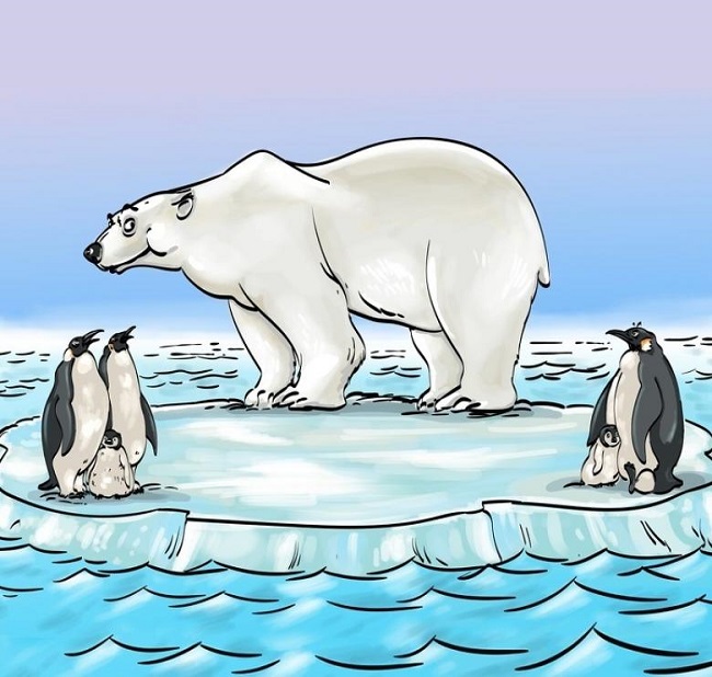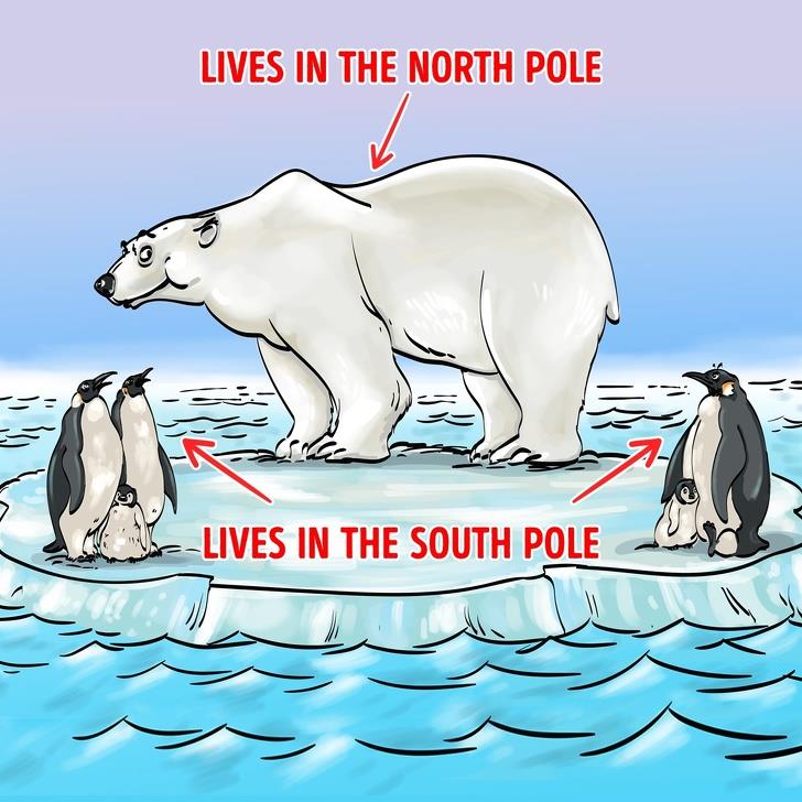 The mistake in this image is not that the piece of ice is not big enough for all the animals or anything else. The answer lies in the geographical in nature. You see, Polar Bears are found at the North Pole of the planet and penguins live at the South Pole of the planet. It makes the anger of the penguins more genuine to see a polar bear near them.