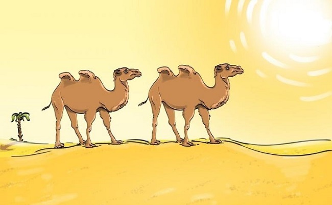 Camels are called the ship of the desert and the image shows two poor camels journeying through the desert, with the blazing sun over them. A small tree is seen in the background.