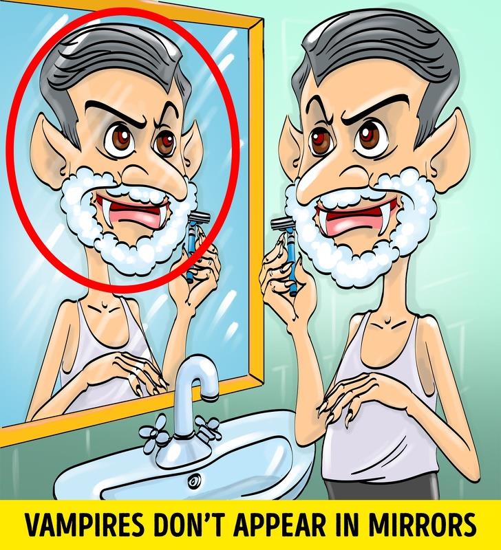 Most people think of seeing the fact that why does a vampire shaving his face, or why is he wearing a vest or anything of that matter. However, people miss the Vampire 101, that Vampires do not have any reflections. Therefore, the image showing his reflection in the mirror is impossible.