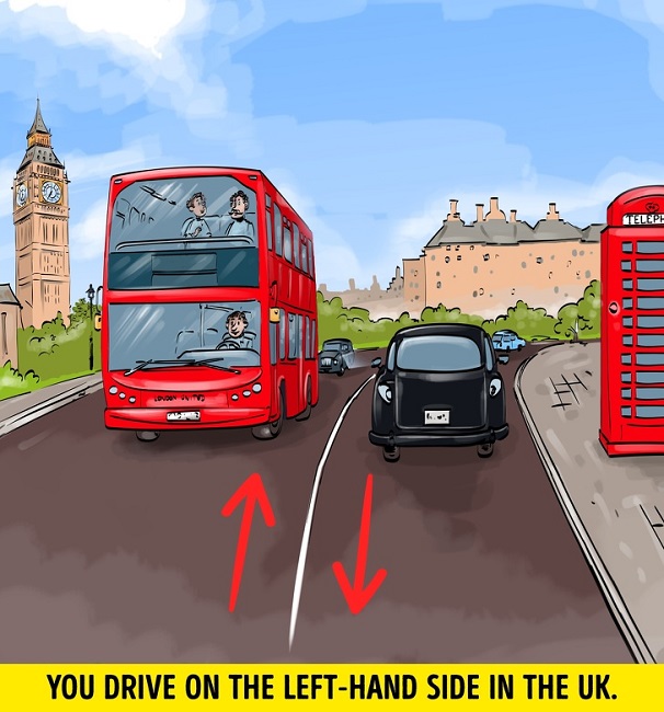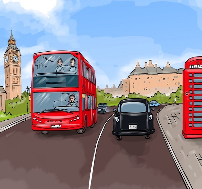 In order to find the mistake in this image, one needs to have a very good knowledge of rules of the road and also a very sincere and keen focus on the image. The mistake in this image is that in the UK, the traffic people drive on the left-hand side of the road, unlike the USA, where people drive on right-hand side.