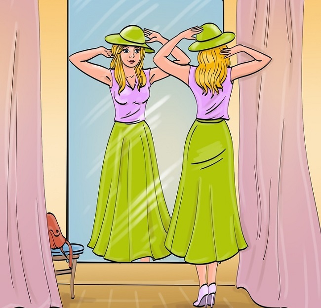 The image shows a girl trying on new clothes and a stylish hat. The girl is admiring herself and the hat in the mirror in the changing booth. She is also seen adjusting the hair and the hat in the process.
