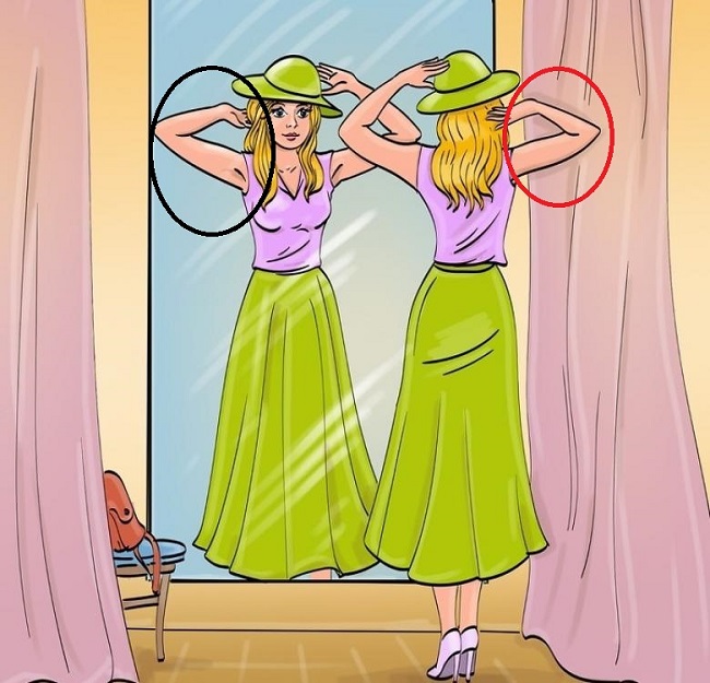 The mistake in this image is something that takes time to notice. The image is full of things which could be a mistake. But the original mistake is in the mirror image of the girl. The positioning of the hands in the mirror image is incorrect. The right hand is shown as the left hand in the mirror and vice versa.