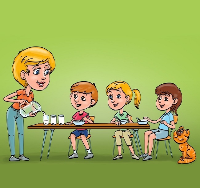 This image shows a mom serving breakfast to her three kids and a very happy cat. There are three glasses on the table full of milk and two bowls of cereal in front of the kids. The mistake in this image is very hard to find.