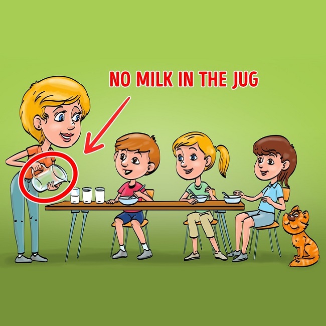 The mistake in this image lies in the details drawn by the artist. Look closely at the jug held by the mother. Though there is milk coming out of it and going into the glass, there is no milk in the jug itself.