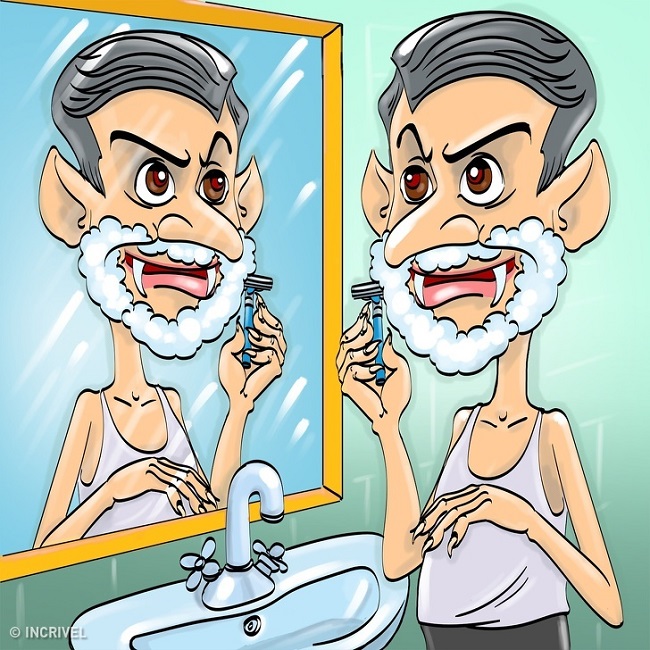 This image a pretty cartoonish looking gentleman, who appears to be a vampire, thanks to the two fangs. He is shown in process of shaving his face and is standing in front of a mirror. There is rich lather of soap on his face, long nails, wearing a vest and has a razor in his hand, ready to make the first move.