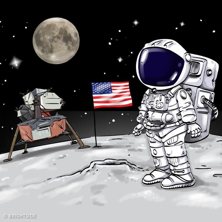 This image shows an astronaut standing on the moon with space in the background. There is an American flag near the astronaut and a spacecraft parked nearby. The mistake in the image is a very difficult one to find as it seems like it is a rework of a photograph, with stars shining in the background.