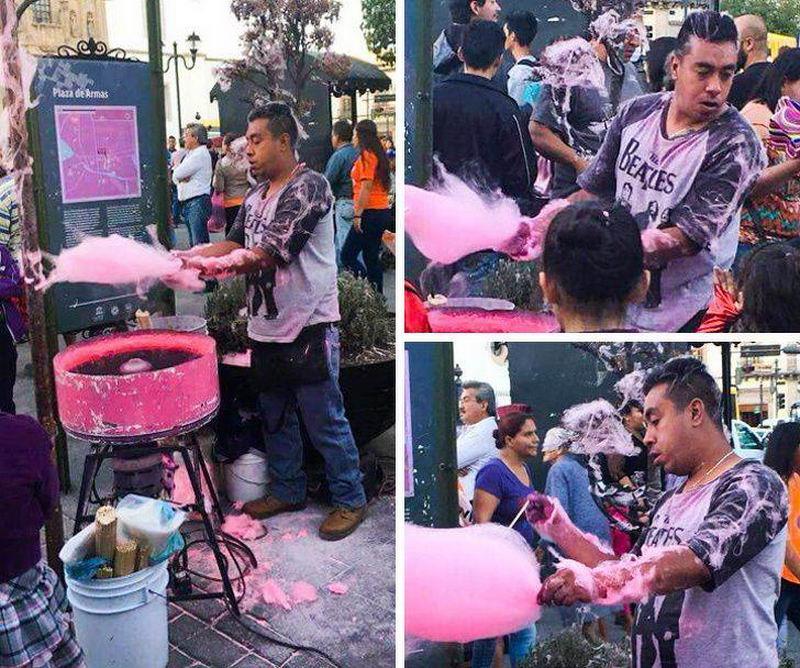 This picture is the best representation of the meme "When you lie on your resume but still get the job". A man just making delicious cotton candy and in the process sugar-coating himself. He clearly has no idea how to do it. You have to give him props for not stopping and not giving up.