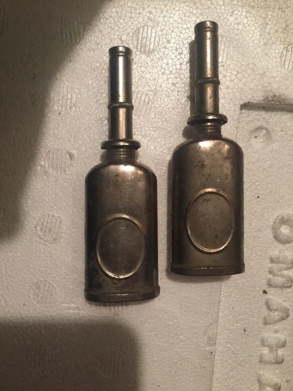 They are containers of oil which were used for lubricating small machines such as sewing machine. You need to press the container from the oval spot and a drop of oil will come out of the container.