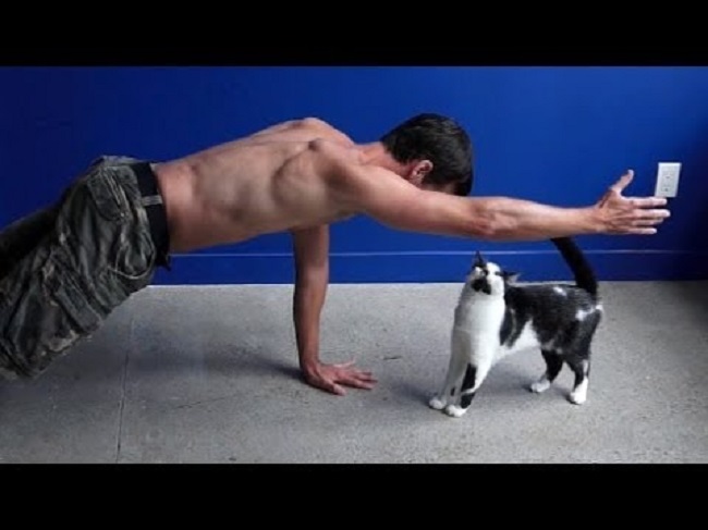 Actually, the ab exercise are for you not your cat but as you perform abs crunches with a torch in your hand, the up and down motion of the light will make your cat exercise too as it runs to chase the light. This way both owner and feline get a workout.