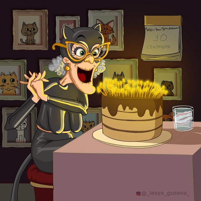 This is an accurate prediction of Catwoman, an aged Catwoman in a room with the walls full of frames of cats and kittens. It’s funny to see her in her iconic cat outfit and mask but is still a treat. The cake looks delicious and with over 50 candles on it. Missing all her teeth is a funny touch.