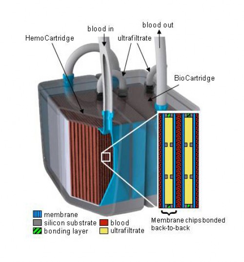 The implantable bioartificial kidney is no bigger than a coffee cup. Once surgery establishes a connection, the device will start processing blood continuously 24 hours that eliminates the inconvenience of dialysis. No batteries or pumps are required; the device works with the body’s own blood pressure pushing blood through the device just like a natural kidney. This is what it will do: