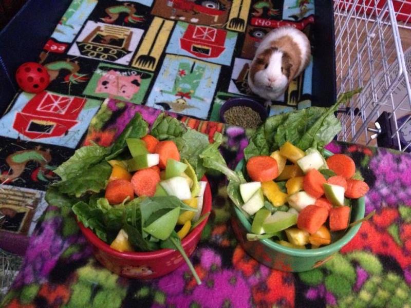 You can offer up to one cup of fresh vegetables a day to freshen up your guinea pig’s diet. Some great daily veggie choices include kale, Romaine lettuce, bell peppers, and spinach. Sweet potato, carrots, zucchini, and carrots can be given once or twice a week to take care of your pet. Fruit is also fine once a week, but it’s high in sugar, so keep portion sizes small -- a slice of banana, a few blueberries, an orange wedge are perfectly adequate!