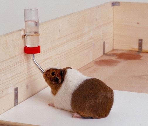 Guinea pigs are thirsty little critters - they require a lot of fresh, clean water in their bottles! The vast majority of their diet is made up of dry food (pellets and a whole lot of hay) and they need something to wash all of that down. A hanging bottle is much more hygienic than a dish of standing water, which tends to get all sorts of stuff in it. Make sure you wash and refill their water supply every day!