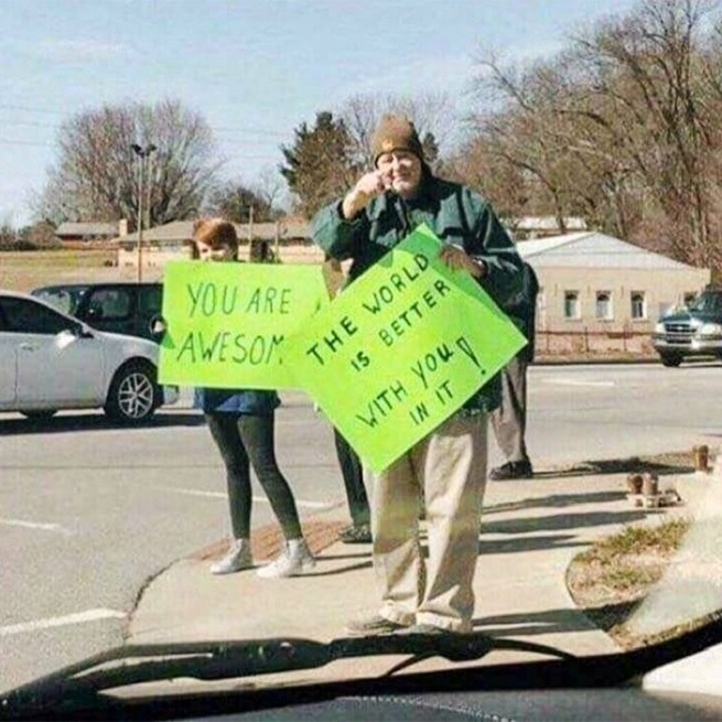 Canadians are very nice people and they like to keep other people happy. When they have leisure time and nothing to do, they simply love to go out and cheer other people. They can be seen holding a placard with a message written on it. This is to uplift the mood of other people.