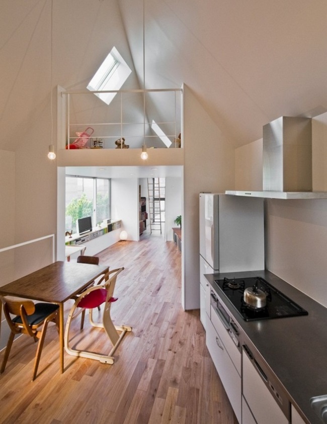 The house has a high ceiling and the area of dining and kitchen is the largest planary. Living space has low ceilings and full windows on both sides. The loft nearby the staircase has a skylight to lit up the whole house and provides a view towards the river. The house is built in Suginami, Tokyo in Japan. The architect of the house is Kota Mizushi of Mizuishi Architects Atelier. Currently a family of a man, his wife and their little daughter occupy the house.